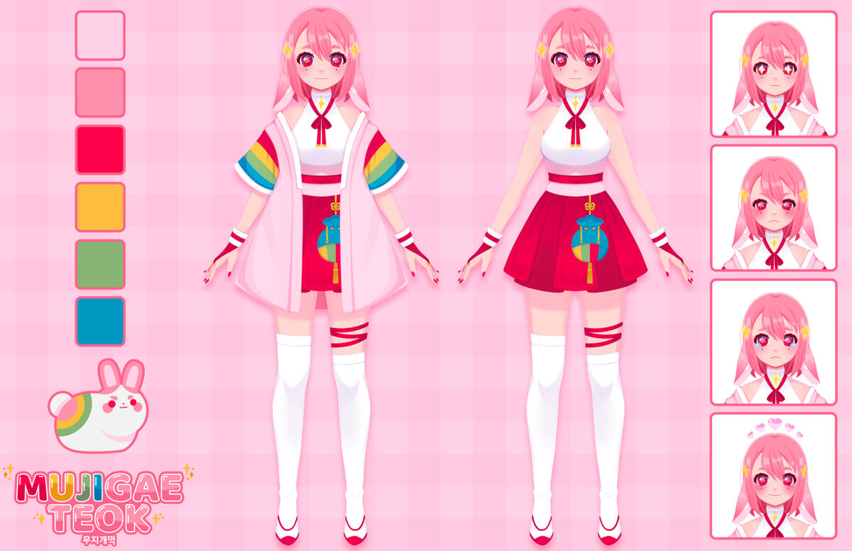 νμΈμ! Nice to meet you all, my name is Mujigae Teok 무μ§κ°λ‘ (Moo-jee-geh-dok), but you can just call me Muji! πMy name actually means rainbow rice cake, and as you can guess, it's one of my favorite snacks! I'm a moon bunny ENVtuber as well as an artist. I actually made most of the assets I use including drawing and rigging my own model! I still have a lot to learn though so I hope you'll stick around and join me on my adventures!Also, in case you were curious, that very round bun you see with me is named Teoki λ‘λΌ (Dok-key), and he's a bunny made of rice cake but please don't nibble on him!